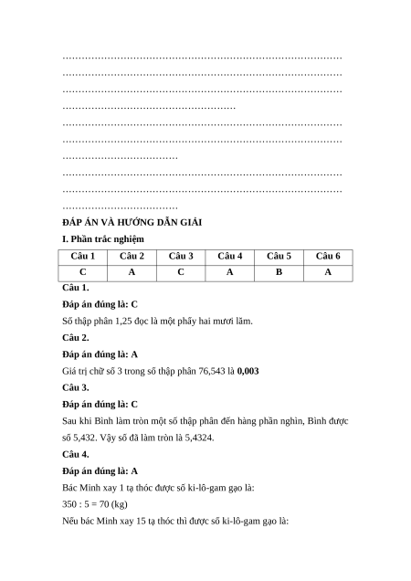 Câu 1. Số thập phân 1,25 đọc là: (0,5 điểm)