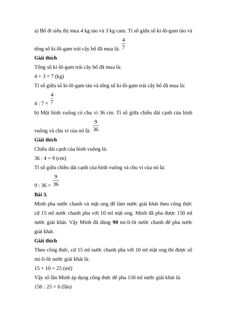 a) Bố đi siêu thị mua 4 kg táo và 3 kg cam. Tỉ số giữa số ki-lô-gam táo và