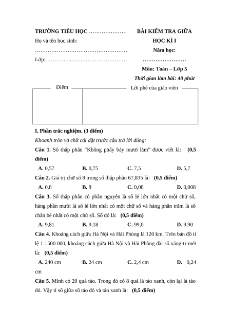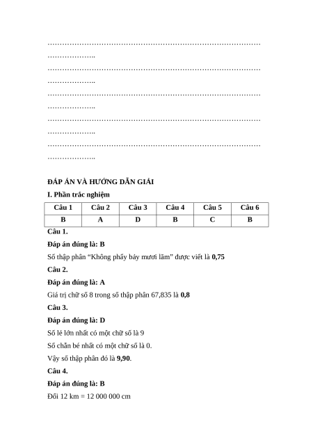 Câu 1. Số thập phân “Không phẩy bảy mươi lăm” được viết là: (0,5 điểm) A. 0,57 B. 0,75 C. 7,5 D. 5,7