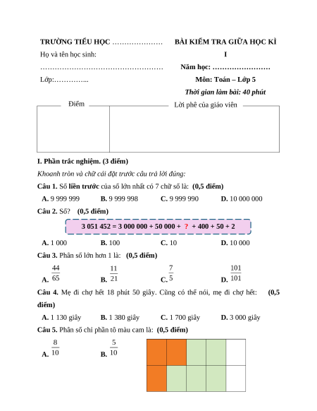 Câu 5. Phân số chỉ phần tô màu cam là: (0,5 điểm) A. B. C. D.