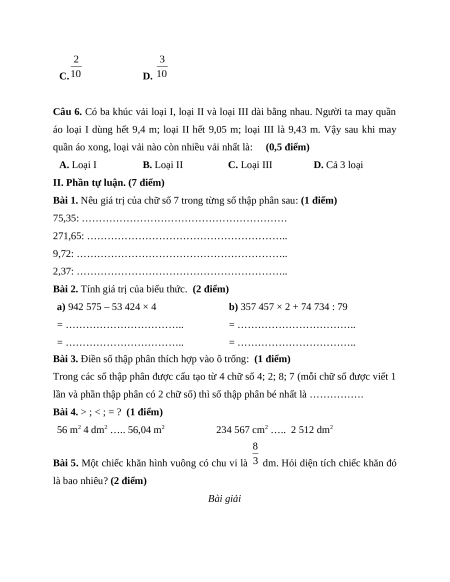 Bài 3. Điền số thập phân thích hợp vào ô trống: (1 điểm)