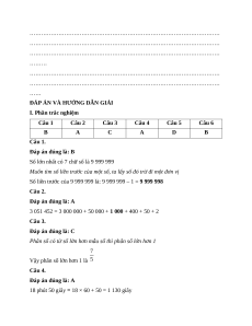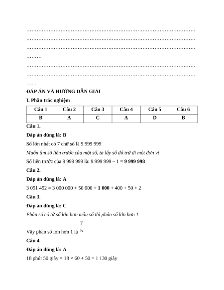 Câu 1. Số liền trước của số lớn nhất có 7 chữ số là: (0,5 điểm) A. 9 999 999 B. 9 999 998 C. 9 999 990 D. 10 000 000