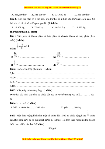 Diện tích đất nước ta là 331 690 km² Câu 6. Đáp án đúng là: B Đổi 6 tấn = 6 000 kg 45 tạ = 4 500 kg
