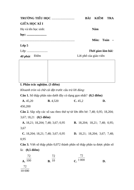 Câu 3. Viết số thập phân 0,072 thành phân số thập phân ta được phân số là: (0,5 điểm) A. B. C. D.
