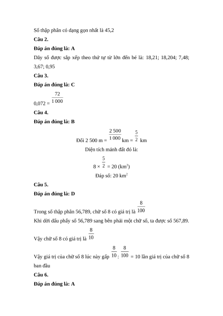 Câu 1. Số thập phân nào dưới đây có dạng gọn nhất? (0,5 điểm) A. 45,20 B. 4,520 C. 45,2 D. 450,200