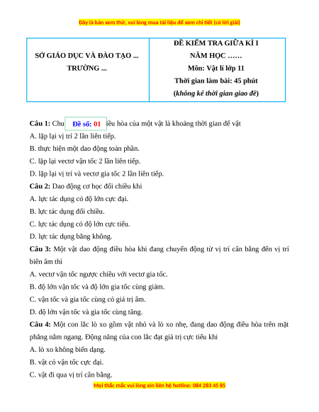 Câu 1: Chu kì dao động điều hòa của một vật là khoảng thời gian để vật Đề số: 01