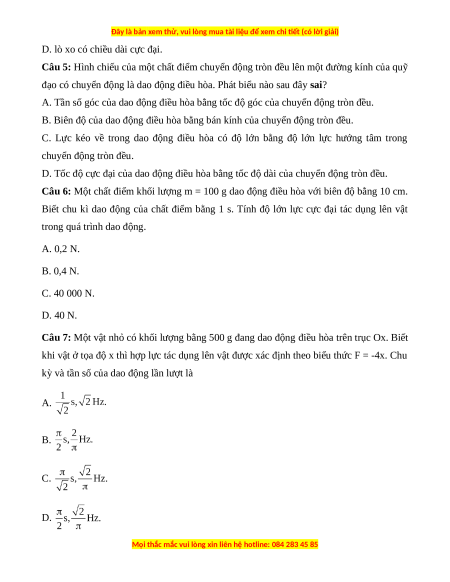 Câu 5: Hình chiếu của một chất điểm chuyển động tròn đều lên một đường kính của quỹ