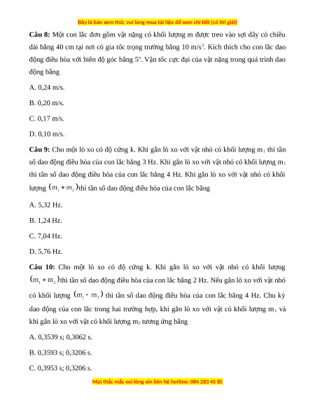 Câu 9: Cho một lò xo có độ cứng k. Khi gắn lò xo với vật nhỏ có khối lượng m1 thì tần