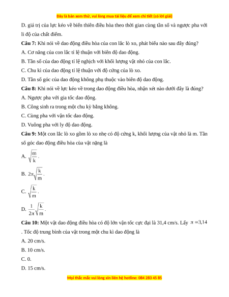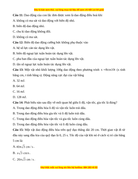 Câu 10: Một vật dao động điều hòa có độ lớn vận tốc cực đại là 31,4 cm/s. Lấy