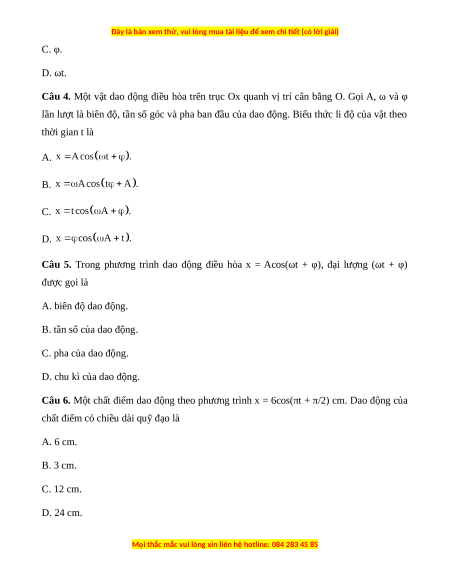 Câu 5. Trong phương trình dao động điều hòa x = Acos(ωt + φ), đại lượng (ωt + φ)