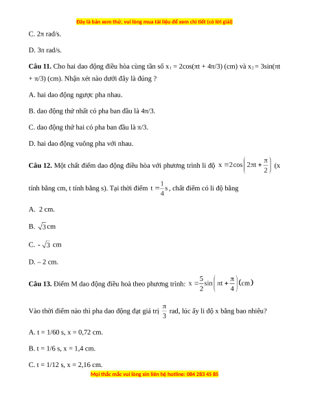 Câu 11. Cho hai dao động điều hòa cùng tần số x1 = 2cos(πt + 4π/3) (cm) và x2 = 3sin(πt