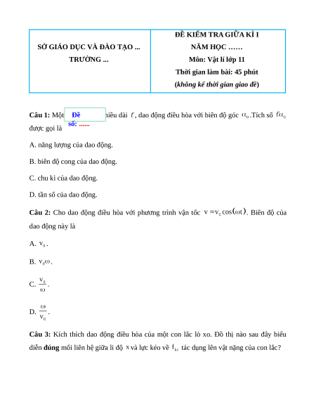 Câu 2: Cho dao động điều hòa với phương trình vận tốc . Biên độ của dao động này là A. . B. . C. . D. .