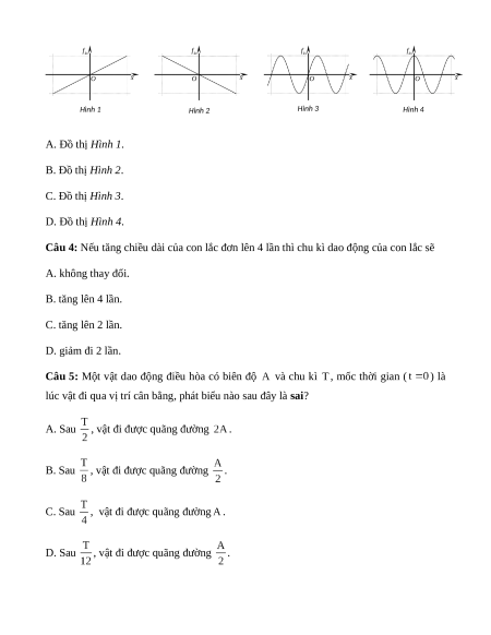 Câu 4: Nếu tăng chiều dài của con lắc đơn lên 4 lần thì chu kì dao động của con lắc sẽ