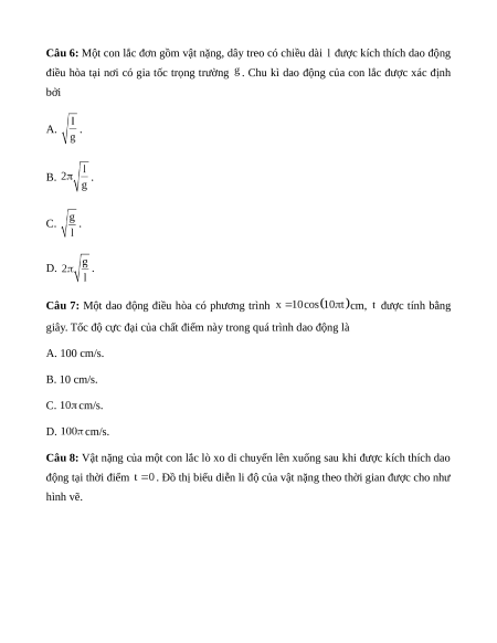 Câu 8: Vật nặng của một con lắc lò xo di chuyển lên xuống sau khi được kích thích dao động tại thời điểm