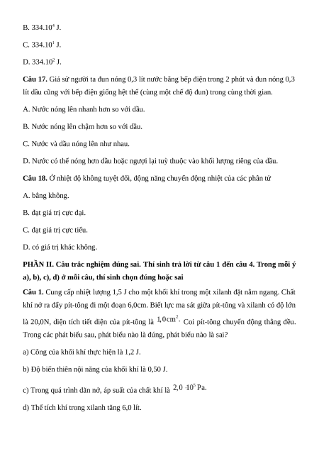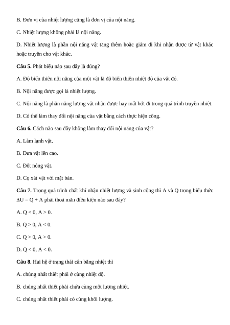 Câu 6. Cách nào sau đây không làm thay đổi nội năng của vật? A. Làm lạnh vật. B. Đưa vật lên cao. C. Đốt nóng vật.