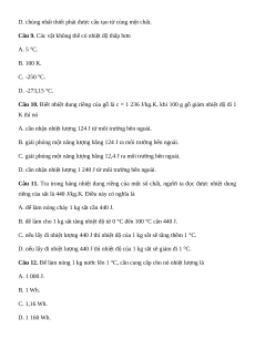 Câu 10. Biết nhiệt dung riêng của gỗ là c = 1 236 J/kg.K, khi 100 g gỗ giảm nhiệt độ đi 1 K thì nó