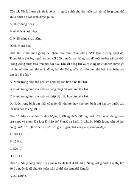 Câu 13. Nhiệt lượng cần thiết để làm 1 kg của chất chuyển hoàn toàn từ thể lỏng sang thể