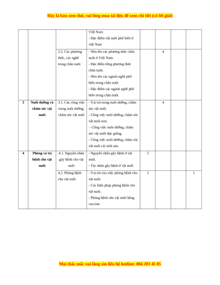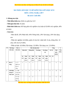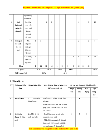nghề trong chăn nuôi 3 Nuôi 3.1. Các 4 6 4 6 10 dưỡng và công việc chăm sóc trong nuôi vật nuôi dưỡng, chăm sóc vật nuôi 4 Phòng và 4.1. 2 3 2 3 5 trị bệnh Nguyên cho vật nhân gây nuôi bệnh cho vật nuôi 4.2. Phòng 2 3 1 5 2 1 8 25 bệnh cho vật nuôi Tổng 8 12 16 18 1 10 1 5 24 2 45 Tỉ lệ (%) 20 % 40 % 20 % 20 % 100% Tỉ lệ chung (%) 60 % 40 % 2. Bản đặc tả TT Nội dung kiến