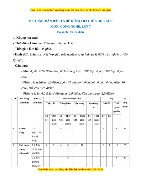 Mức độ nhận thức Tổng % kiến thức kiến thức tổng Nhận biết Thông hiểu Vận dụng Vận dụng Số CH Thời điểm cao gian (phút) Số Thời Số Thời Số Thời Số Thời TN TL CH gian CH gian CH gian CH gian (phút) (phút) (phút) (phút) 1 Bảo vệ 1.1. Ý 2 3 4 3 6 6 15 rừng nghĩa của bảo vệ rừng 2 Giới thiệu 2.1. Một 2 3 4 3 1 10 6 1 16 35 chung về số vật nuôi chăn nuôi phổ biến 2.2. Các 4 6 4 6 10 phương thức, các