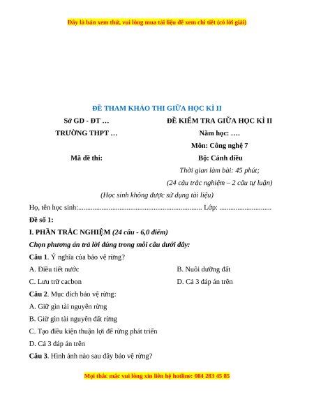 ĐỀ KIỂM TRA GIỮA HỌC KÌ II TRƯỜNG THPT … Năm học: …. Môn: Công nghệ 7 Mã đề thi: Bộ: Cánh diều