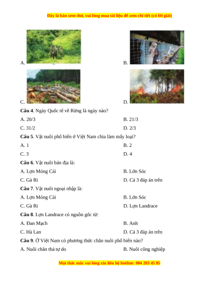 Câu 1. Ý nghĩa của bảo vệ rừng? A. Điều tiết nước B. Nuôi dưỡng đất C. Lưu trữ cacbon D. Cả 3 đáp án trên