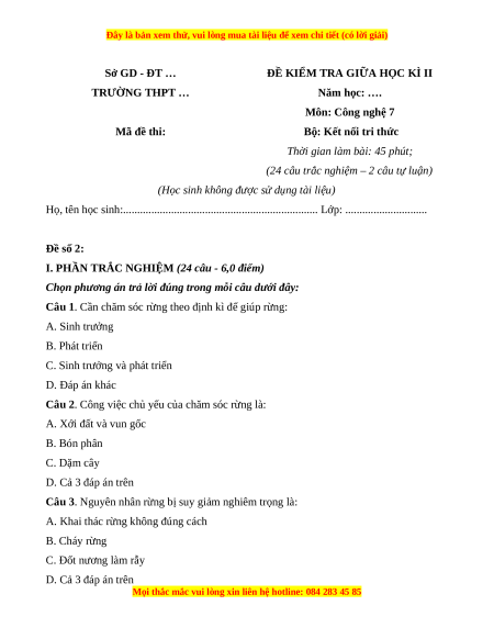 ĐỀ KIỂM TRA GIỮA HỌC KÌ II TRƯỜNG THPT … Năm học: …. Môn: Công nghệ 7 Mã đề thi:
