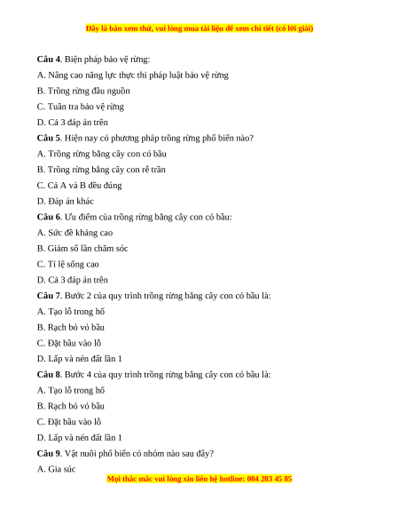 Câu 7. Bước 2 của quy trình trồng rừng bằng cây con có bầu là: A. Tạo lỗ trong hố B. Rạch bỏ vỏ bầu C. Đặt bầu vào lỗ
