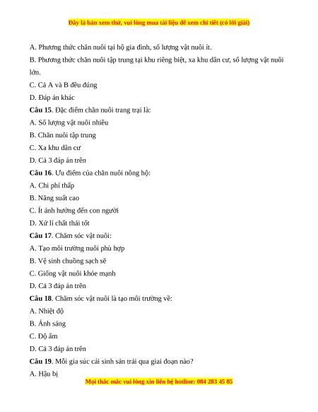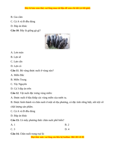 Câu 13. Có mấy phương thức chăn nuôi phổ biến? A. 1 B. 2 C. 3 D. 4