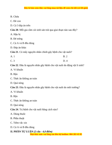 Câu 18. Chăm sóc vật nuôi là tạo môi trường về: A. Nhiệt độ B. Ánh sáng C. Độ ẩm D. Cả 3 đáp án trên