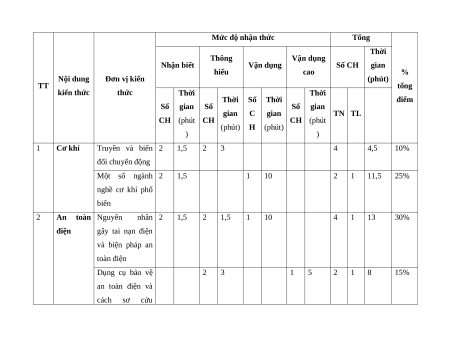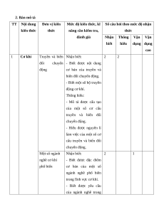 Mức độ nhận thức Tổng Thời Thông Vận dụng Nhận biết Vận dụng Số CH gian hiểu cao % Nội dung Đơn vị kiến (phút) TT tổng kiến thức thức Thời Thời Thời Số Thời điểm Số gian Số Số gian gian C gian TN TL CH (phút CH CH (phút (phút) H (phút) ) ) 1 Cơ khí Truyền và biến 2 1,5 2 3 4 4,5 10% đổi chuyển động Một số ngành 2 1,5 1 10 2 1 11,5 25% nghề cơ khí phổ biến 2