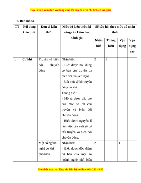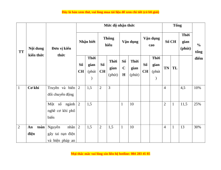 Mức độ nhận thức Tổng Thời Thông Vận dụng Nhận biết Vận dụng Số CH gian hiểu cao % Nội dung Đơn vị kiến (phút) TT tổng kiến thức thức Thời Thời điểm Thời Số Thời Số gian Số Số gian gian C gian TN TL CH (phút CH CH (phút (phút) H (phút) ) ) 1 Cơ khí Truyền và biến 2 1,5 2 3 4 4,5 10% đổi chuyển động Một số ngành 2 1,5 1 10 2 1 11,5 25% nghề cơ khí phổ biến 2