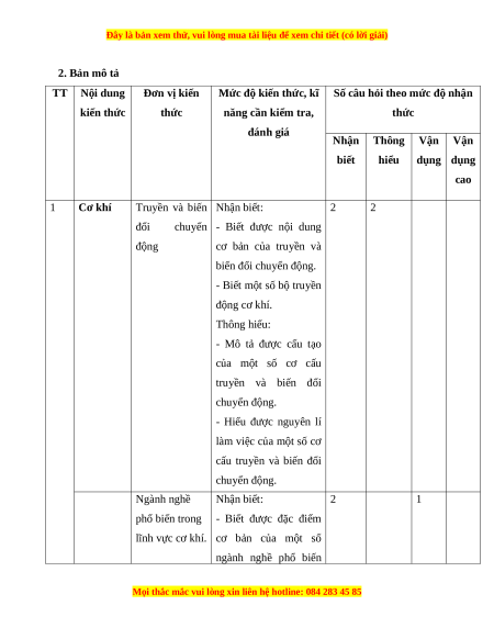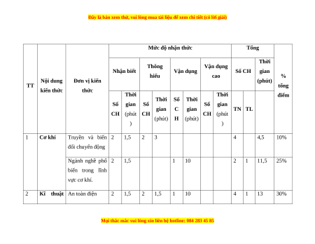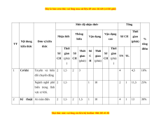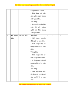 Mức độ nhận thức Tổng Thời Thông Vận dụng Nhận biết Vận dụng Số CH gian hiểu cao % Nội dung Đơn vị kiến (phút) TT tổng kiến thức thức Thời Thời điểm Thời Số Thời Số gian Số Số gian gian C gian TN TL CH (phút CH CH (phút (phút) H (phút) ) ) 1 Cơ khí Truyền và biến 2 1,5 2 3 4 4,5 10% đổi chuyển động Ngành nghề phổ 2 1,5 1 10 2 1 11,5 25% biến trong lĩnh vực cơ khí. 2
