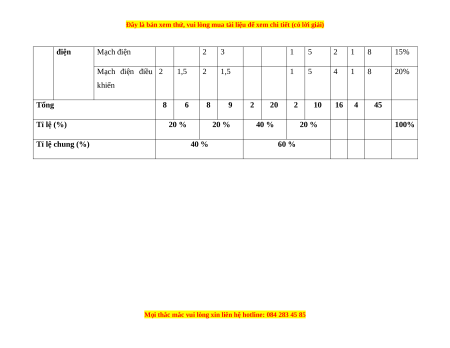 điện Mạch điện 2 3 1 5 2 1 8 15% Mạch điện điều 2 1,5 2 1,5 1 5 4 1 8 20% khiển Tổng 8 6 8 9 2 20 2 10 16 4 45 Tỉ lệ (%) 20 % 20 % 40 % 20 % 100% Tỉ lệ chung (%) 40 % 60 %