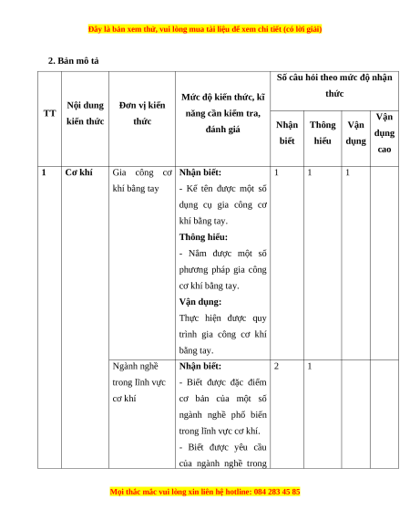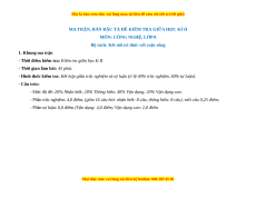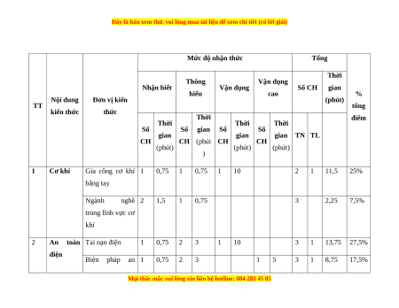 Mức độ nhận thức Tổng Thời Thông Vận dụng Nhận biết Vận dụng Số CH gian hiểu cao % Nội dung Đơn vị kiến (phút) TT tổng kiến thức thức Thời điểm Thời Thời Thời Số Số gian Số Số gian gian gian TN TL CH CH (phút CH CH (phút) (phút) (phút) ) 1 Cơ khí Gia công cơ khí 1 0,75 1 0,75 1 10 2 1 11,5 25% bằng tay Ngành nghề 2 1,5 1 0,75 3 2,25 7,5% trong lĩnh vực cơ khí 2