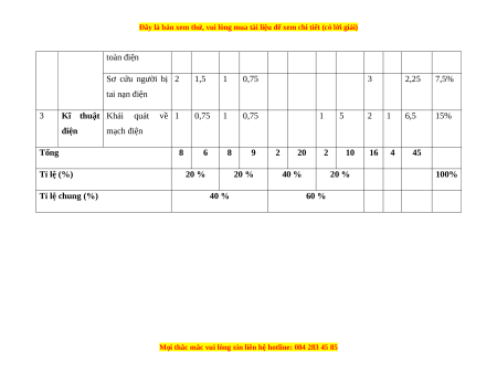 Kĩ thuật Khái quát về 1 0,75 1 0,75 1 5 2 1 6,5 15% điện mạch điện Tổng 8 6 8 9 2 20 2 10 16 4 45 Tỉ lệ (%) 20 % 20 % 40 % 20 % 100% Tỉ lệ chung (%) 40 % 60 %