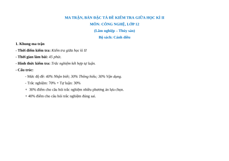 Đề thi Giữa kì 2 Công nghệ Lâm nghiệp Thủy sản 12 Cánh diều