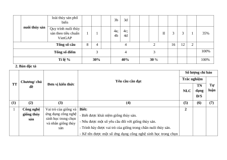 Đơn vị kiến thức Tự luận % T đề chọn Đúng/Sai điểm Hiể Hiể Biế Hiể Hiể Biết VD Biết VD VD Biết VD u u t u u (1 (1 (1 (1 (1 (2) (3) (4) (5) (6) (7) (8) (9) (11) (14) (16) ) 0) 2) 3) 5) Vai trò của giống và ứng dụng công nghệ sinh học trong chọn 2 2 5% Công nghệ và nhân giống thủy 1 giống thủy sản sản Đặc điểm sinh sản và kĩ thuật ương cá, 2 2 5% tôm giống Thành phần dinh 1a; 1c; dưỡng của thức ăn 1 1 3 3 15% Công nghệ 1b 1d thủy sản 2 thức ăn thủy sản Chế biến và bảo 2a; 2c; quản thức ăn thủy 1 1 3 3 15% 2b 2d sản 3 Công nghệ Kĩ thuật nuôi một số 1 1 3a; 3c; I 3 3 1 25% loài thủy sản phổ 3b 3d biến nuôi thủy sản Quy trình nuôi thủy 4a; 4c; sản theo tiêu chuẩn 1 1 II 3 3 1 35% 4b 4d VietGAP Tổng số câu 8 4 4 2 16 12 2 Tổng số điểm 3 4 3 100% Tỉ lệ % 30% 40% 30 % 100% 2. Bản đặc tả