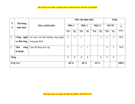 Thủ công Làm đồ dùng học tập 3 1 1 4 1 50% kĩ thuật Tổng 5 1 2 1 1 7 3 Tỉ lệ (%) 60 % 30 % 10 % 100%