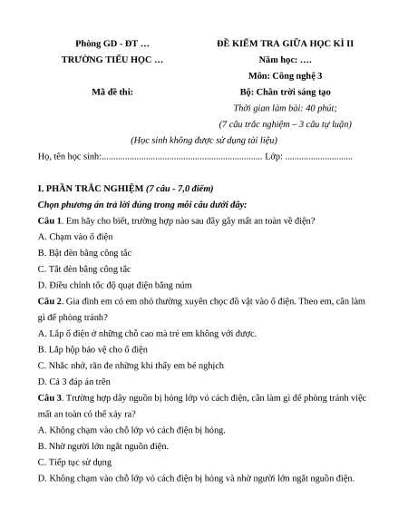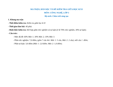 - Tailieugiaovien.com.vn giới thiệu đề thi giữa kì 2 gồm đầy đủ ma trận và lời giải chi tiết môn Công nghệ lớp 3 Chân trời sáng tạo mới nhất nhằm giúp Giáo viên có thêm tài liệu tham khảo ra đề thi Công nghệ lớp 3.