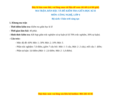 - Tailieugiaovien.com.vn giới thiệu bộ đề giữa kì 2 gồm đầy đủ ma trận và lời giải chi tiết môn Công nghệ lớp 4 Chân trời sáng tạo mới nhất nhằm giúp Giáo viên có thêm tài liệu tham khảo ra đề thi Công nghệ lớp 4.