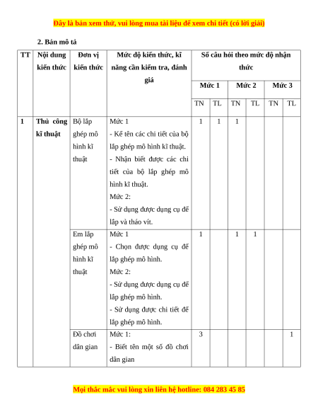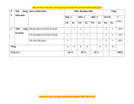 năng cần kiểm tra, đánh thức giá Mức 1 Mức 2 Mức 3 TN TL TN TL TN TL 1 Thủ công Bộ lắp Mức 1 1 1 1 kĩ thuật ghép mô