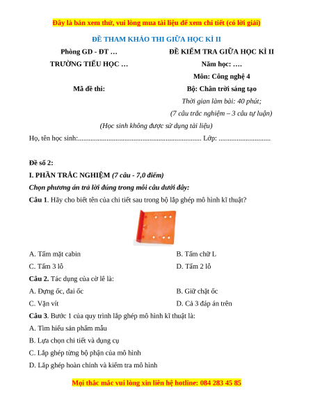 Câu 1. Hãy cho biết tên của chi tiết sau trong bộ lắp ghép mô hình kĩ thuật? A. Tấm mặt cabin B. Tấm chữ L C. Tấm 3 lỗ D. Tấm 2 lỗ