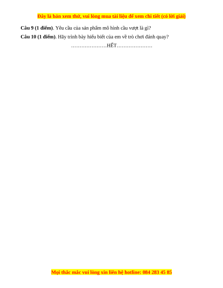 Câu 9 (1 điểm). Yêu cầu của sản phẩm mô hình cầu vượt là gì?
