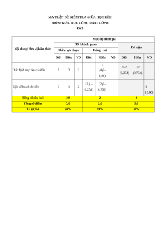 Xác định mục tiêu cá nhân 7 2 2 (4 ý - (0,25đ) (0,75đ) 1,0đ) (2 ý - (2 ý - Lập kế hoạch chi tiêu 6 1 2 1 0,25đ) 0,75đ) (2,0đ) Tổng số câu hỏi 20 2 2 Tổng số điểm 5,0 2,0 3,0 Tỉ lệ (%) 50% 20% 30%
