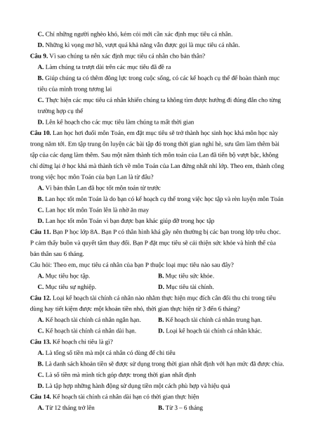 Câu 12. Loại kế hoạch tài chính cá nhân nào nhằm thực hiện mục đích cân đối thu chi trong tiêu