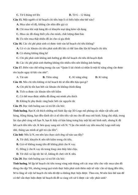 Câu 15. Một người có kế hoạch chi tiêu hợp lí có biểu hiện như thế nào?
