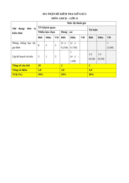 Nội dung/ đơn vị TN khách quan Tự luận kiến thức Nhiều lựa chọn Đúng - sai Biết Hiểu VD Biết Hiểu VD Biết Hiểu VD Phòng chống bạo lực (2 ý - (2 ý - 1 8 2 2 gia đình 0,25đ) 0,75đ) (2,0đ) 1 1/2 1/2 Lập kế hoạch chi tiêu 5 1 2 (4 ý - (0,5đ) (0,5đ) 1,0đ) Tổng số câu hỏi 20 2 2 Tổng số điểm 5,0 2,0 3,0 Tỉ lệ (%) 50% 20% 30%