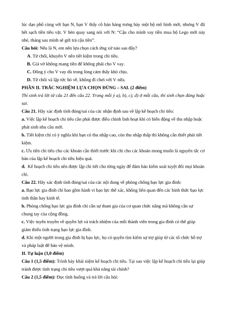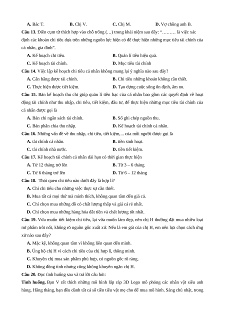 Câu 15. Bản kế hoạch thu chi giúp quản lí tiền bạc của cá nhân bao gồm các quyết định về hoạt