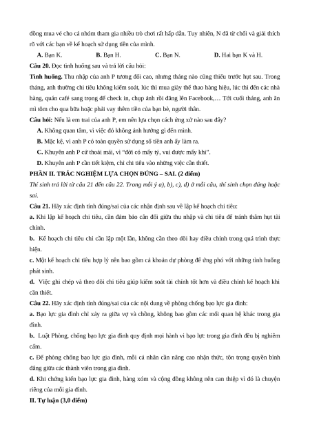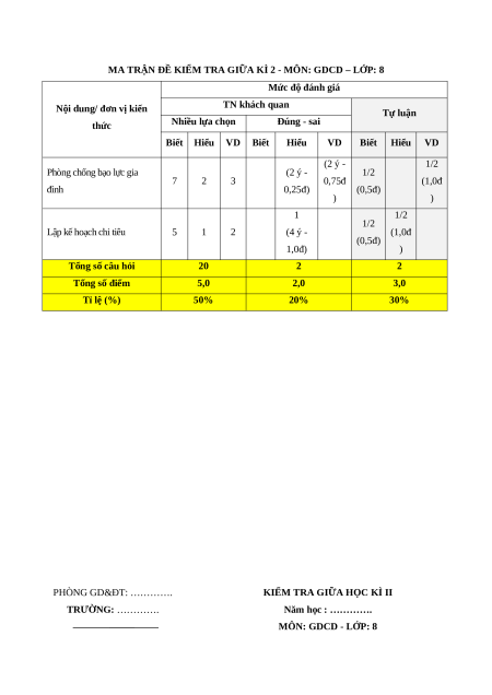 Phòng chống bạo lực gia (2 ý - 1/2 7 2 3 0,75đ (1,0đ đình 0,25đ) (0,5đ) ) ) 1 1/2 1/2 Lập kế hoạch chi tiêu 5 1 2 (4 ý - (1,0đ (0,5đ) 1,0đ) ) Tổng số câu hỏi 20 2 2 Tổng số điểm 5,0 2,0 3,0 Tỉ lệ (%) 50% 20% 30%