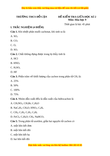 ệ đ xe ể m chi ti t (c ế ó lời gi i ả ) TRƯ N Ờ G THCS Đ C Ỗ N Ậ ĐỀ KIỂM TRA GI A Ữ H C Ọ KÌ 2 Môn: Hóa h c 9 ọ Th i ờ gian là bài: 45 phút I. TRẮC NGHI M Ệ (4 ĐI M) Ể Câu 1. Khi nhi t ệ phân mu i